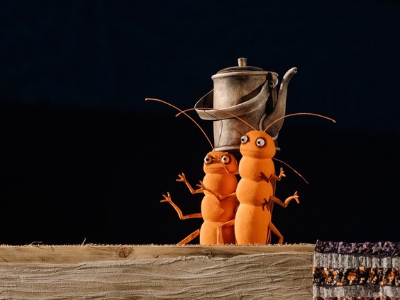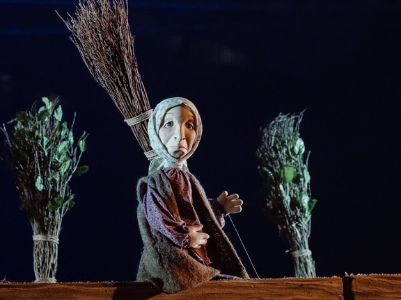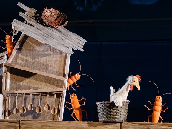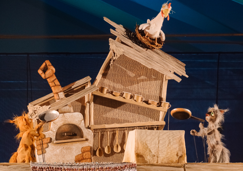 В ширмовом спектакле использованы тростевые куклы, куклы на потычках и маппеты. Постановка насыщена визуальными и техническими приемами.