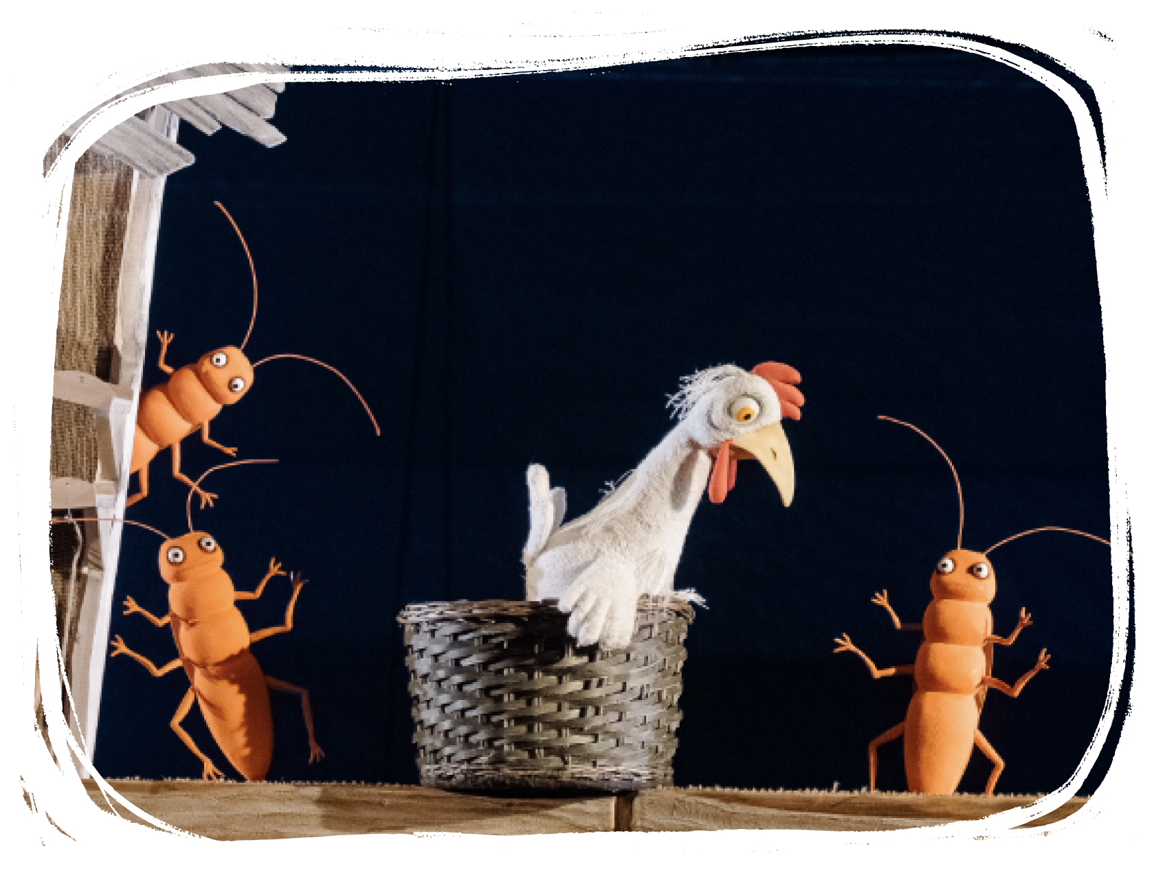 В ширмовом спектакле использованы тростевые куклы, куклы на потычках и маппеты. Постановка насыщена визуальными и техническими приемами.