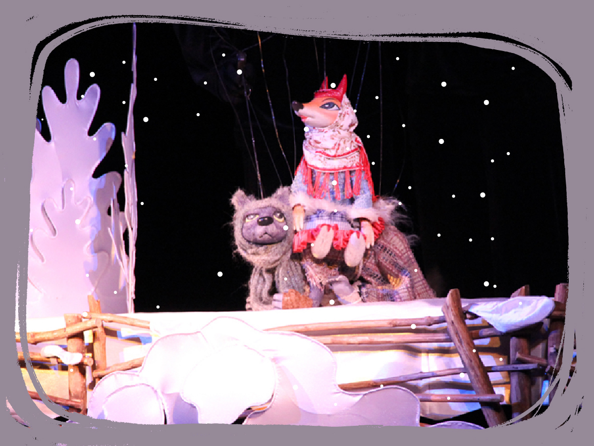 «Не ноги волка кормят, а острый волчий ум», — будто в насмешку над самим собой напевает горе-рыбак, пока его хвост полощется в ледяной проруби. Спектакль отличается прямотой и простотой высказывания: легкая и «белая» атмосфера снежной русской зимы создает соответствующий настрой у зрителя. Сама Зима — одушевлена; она — один из персонажей спектакля, «раздробленный» на несколько образов. Снеговик маленький, Снеговик большой, Снежный дедушка — герои не менее активные и значимые, чем Волк с Лисой.