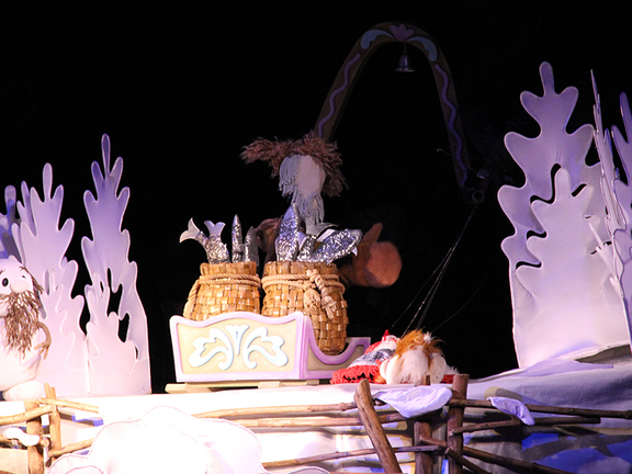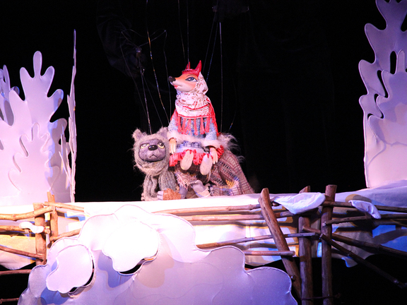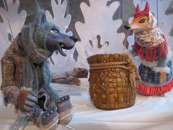 «Не ноги волка кормят, а острый волчий ум», — будто в насмешку над самим собой напевает горе-рыбак, пока его хвост полощется в ледяной проруби. Спектакль отличается прямотой и простотой высказывания: легкая и «белая» атмосфера снежной русской зимы создает соответствующий настрой у зрителя. Сама Зима — одушевлена; она — один из персонажей спектакля, «раздробленный» на несколько образов. Снеговик маленький, Снеговик большой, Снежный дедушка — герои не менее активные и значимые, чем Волк с Лисой.