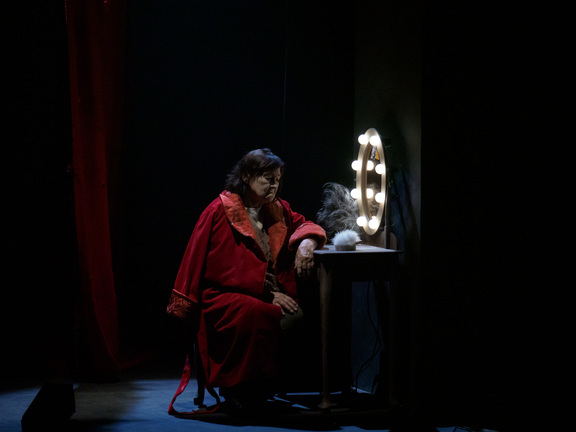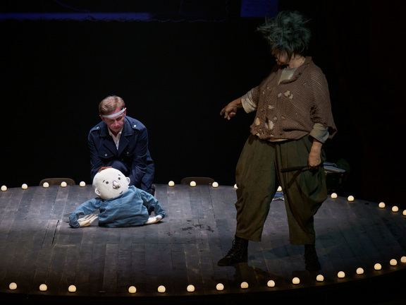 История Саши Савельева рассказана в декорациях и эстетике цирка со свойственной ему буффонадой. Карикатурные куклы, сцена-арена в виде круга, клоунские элементы в костюмах, гротесковая игра актеров. Всё это — мир бабушки, мир несостоявшейся актрисы, которая превращает любое помещение (будь то ванная или кухня) в сценическое пространство, а самую обычную жизненную ситуацию — в очередное действие бесконечного представления.
