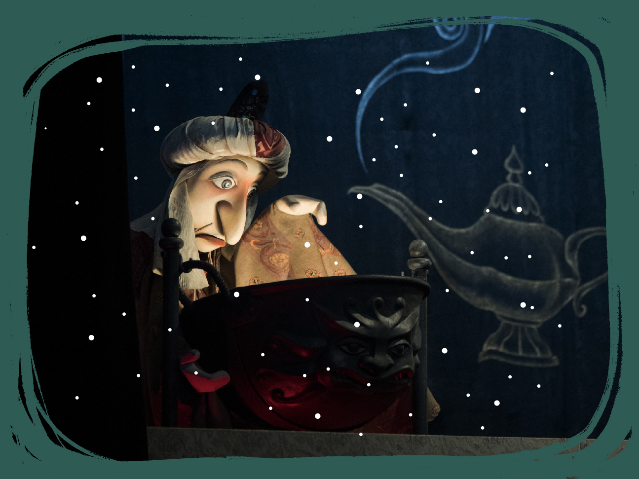 Классический сюжет из сказок «Тысячи и одной ночи» в постановке на ширме с настоящими «кукольными» эффектами.