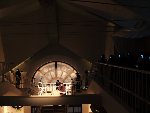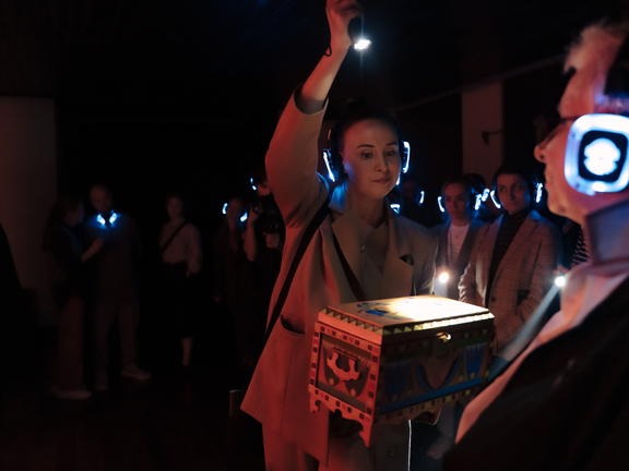 Формат аудиоспектакля-променада предполагает, что постановка охватывает несколько локаций в здании театра. Каждый из участников спектакля получает на входе радиооборудование, настроенное на определенную волну. В разных помещениях театра сконструированы тематические инсталляции и каждой из них соответствует аудио- и видеоконтент, а также события, рождающиеся «здесь и сейчас» в непосредственной близости к зрителю.